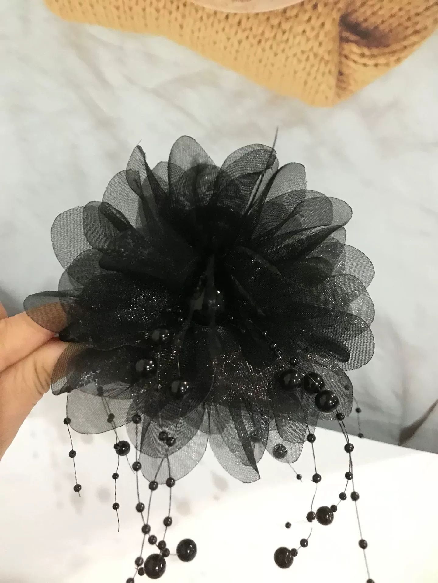 🌹 Thiết kế tinh tế: Bông hoa voan mềm mại, phối cùng hạt ngọc rủ nhẹ – tạo điểm nhấn nổi bật, sang chảnh.