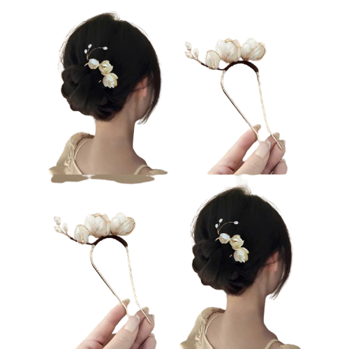 Kẹp tóc hoa cài búi với thiết kế hoa nhỏ xinh, tone màu nhã nhặn, khung kim loại mảnh nhẹ tạo cảm giác thanh thoát và tinh tế 🌸