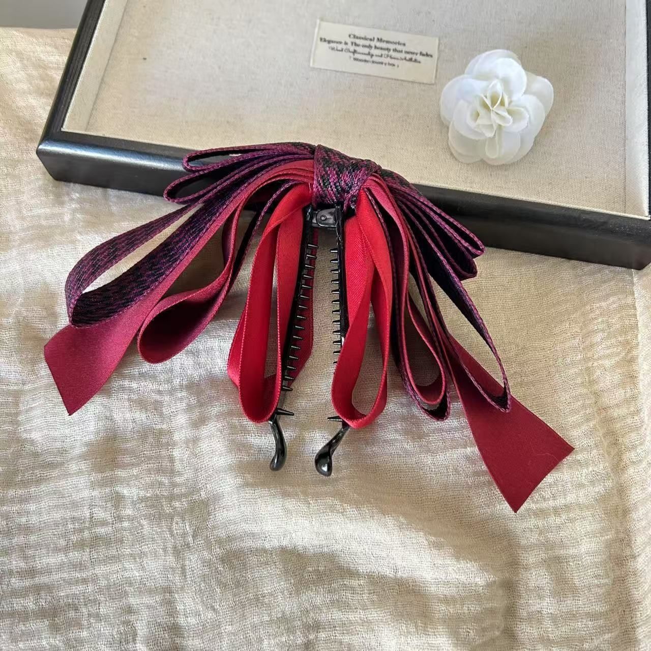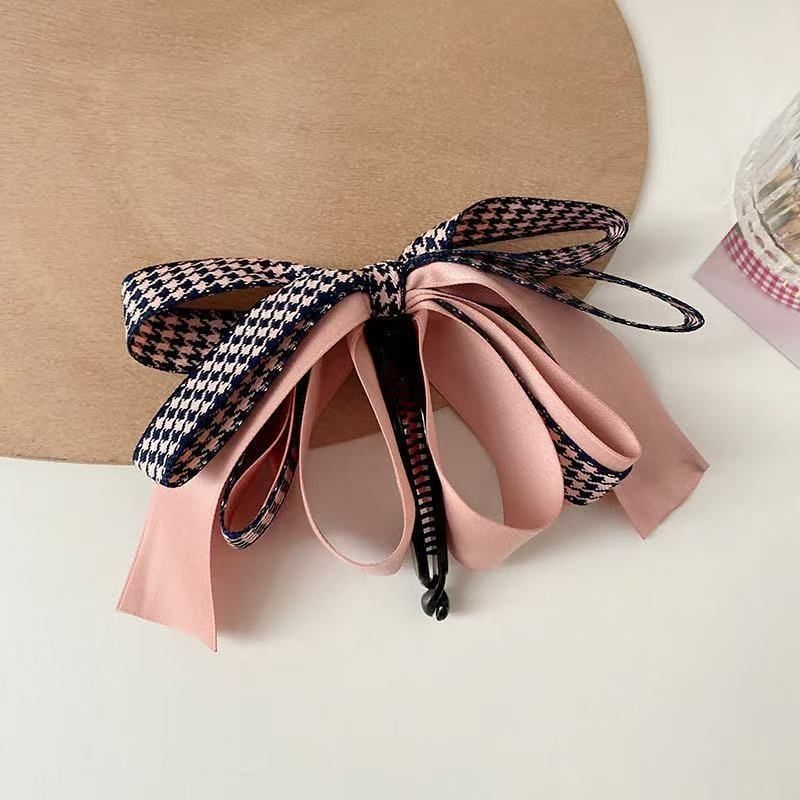 - Thiết kế nơ lớn cầu kỳ với nhiều lớp ruy băng xòe đẹp, viền đen huyền bí + caro/hồng/đỏ ngọt ngào, vibe romantic princess đỉnh cao 🌸