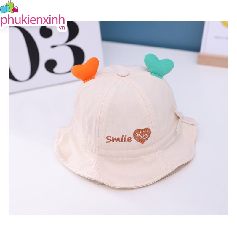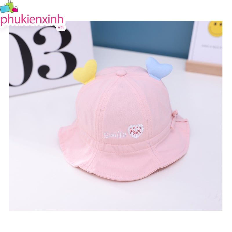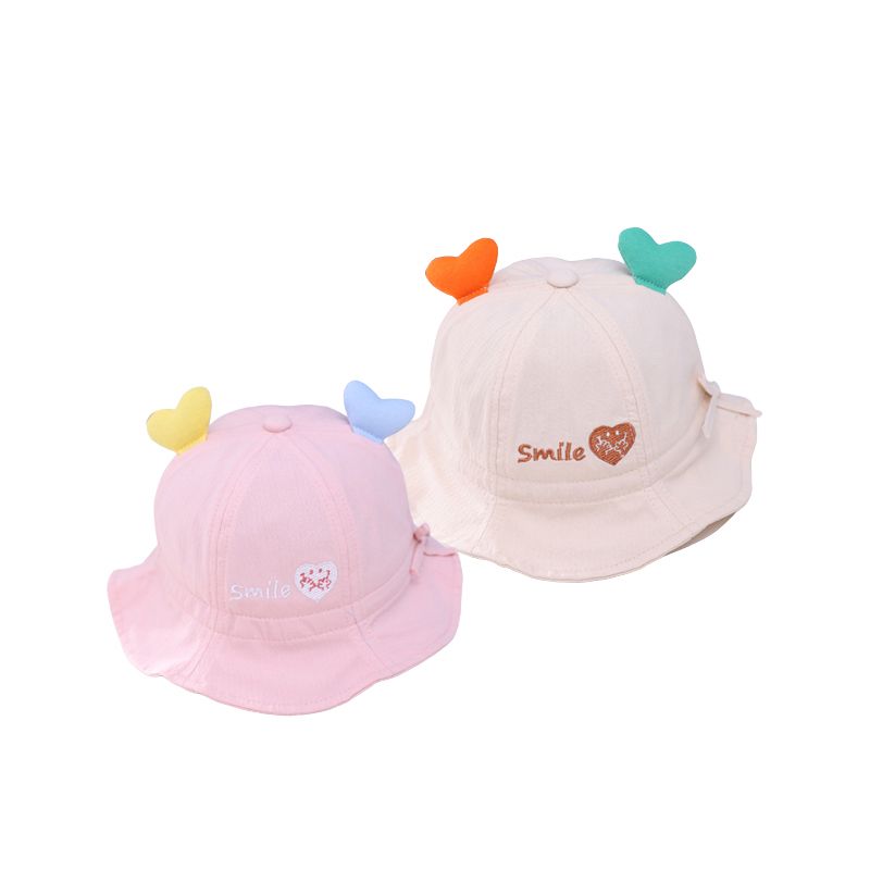 Nón em bé NCC73 mang thiết kế xô tai mềm, viền rộng giúp che nắng hiệu quả, kèm trang trí tim màu sắc dễ thương phù hợp cho các bé từ nhỏ đến mẫu giáo.