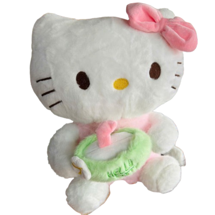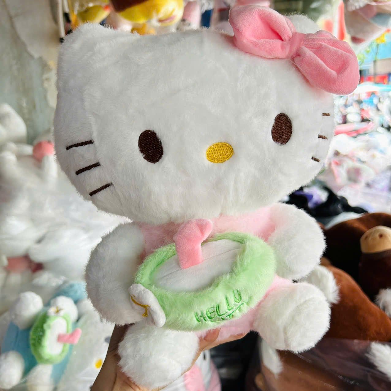 Ôi các bạn ơi, Hello Kitty chính chủ đây rồi nèee! 🥹💖 Chú mèo trắng kinh điển với nơ hồng to bự xinh xắn, mắt đen tròn xoe, mũi vàng cute, tay cầm vòng donut xanh lá siêu đáng yêu – size 30cm vừa đủ để ôm ấp mỗi đêm, nhìn là "tan chảy" luôn á!